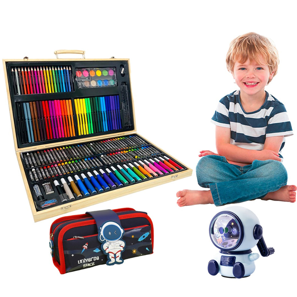 Coo11 Kids 180 PCS Drawing Art Markers Brush Pen Set and Kids Astronaut Design Pencil Sharpener and 2-in-1 Blue Big Capacity and Large Multiple Storage Pen & Pencil Pouch