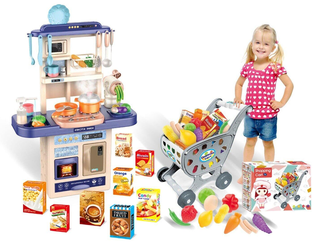 Coo11 Kids 69 pcs Pretended Kitchen Playset with Light and Kids Shopping Cart Trolley Toy Supermarket Playset with Fruit and Vegetables