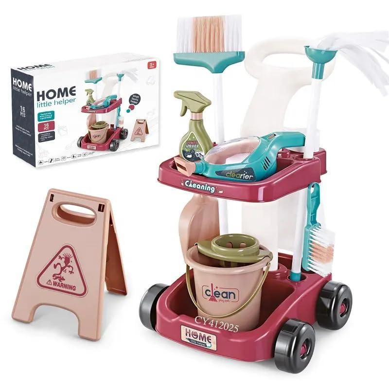 Coo11 Kids Cleaning Mini Set, Toy Cleaning Set Includes Vacuum, Broom, Mop, Brush, Dust Pan, Duster, Sponge, Bucket, Caution Sign, Trash Can, Kids cleaning play set trolly, Educational Toys