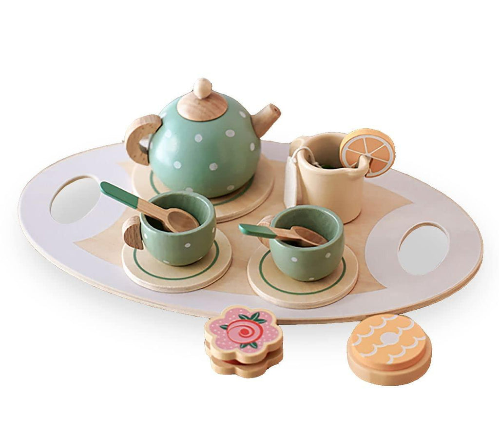 Coo11 Kids Multicoloured Pretend Play Wooden Afternoon Tea Set, Includes 1 Teapot, 2 Cup & Saucers, 1 Mug, 2 Spoons,1 Tray and Food Pots for Kids 3 Years and up